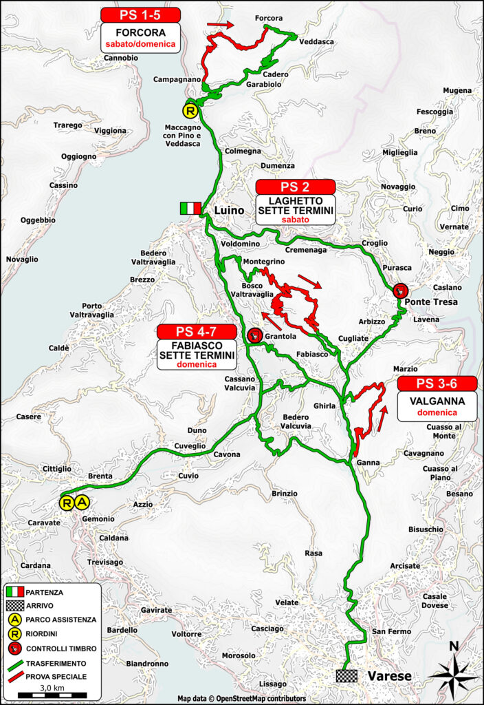 Motori accesi da sabato 28 febbraio: la giornata si apre con lo shakedown, prove tecniche in assetto da gara, sui 2.400 metri in salita dal laghetto di Montegrino. Partenza gara nel centro di Luino, sul lungolago di via Dante, assistenza alla Colacem di Caravate e riordini a Maccagno con controllo timbro a Grantola e Ponte Tresa.